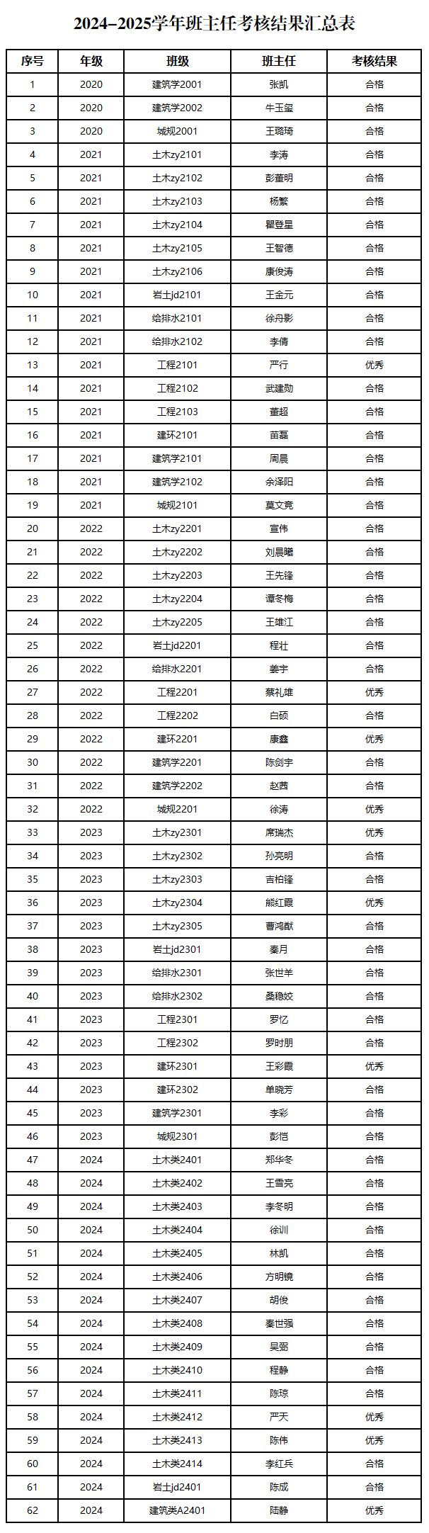 按照《武汉理工大学学生政工干部队伍建设规划》(校党学字〔2010〕1号)、《武汉理工大学班主任(班导师)队伍建设实施细则》(校学字〔2012〕4号)以及《红宝石官方网站hbs160“名师名导”班主任选聘及管理办法》的有关要求,结合学生班级综合测评以及学生对班主任老师工作的评价,土建学院对2024-2025学年班主任工作进行了考核,现将考核结果公示如下,公示期为:2025年10月22日-2025年10月25日12:00,请有不同意见者在公示期内与土建学院学工办联系,电话027-87213949。
